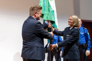 Am Sonntag, dem 1. Dezember 2024, wurde Barbara Reifler offiziell als neue Kommandantin der Kantonspolizei St.Gallen eingesetzt. Im Rahmen einer würdigen Feier, an der das gesamte Kader der Kantonspolizei sowie zahlreiche persönliche Gäste teilnahmen, übergab Regierungsrat Christof Hartmann der neuen Führungspersönlichkeit die Fahne der Kantonspolizei. Dieses bedeutungsvolle Symbol steht für die Verantwortung und das Vertrauen, das Reifler in ihrer neuen Rolle für die Sicherheit der Bevölkerung des Kantons tragen wird.